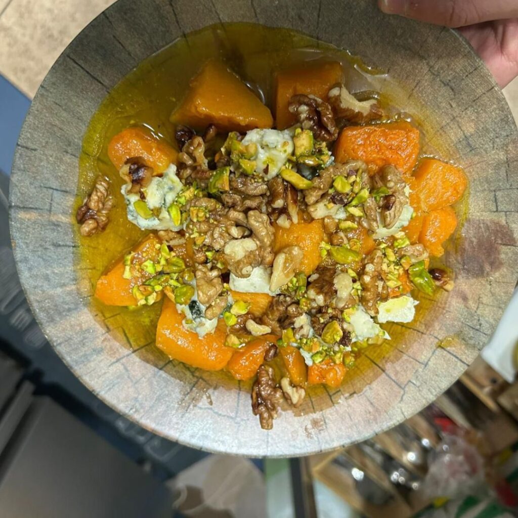 Y mientras los vinos contaban su historia, la cocina hizo exactamente lo que debe hacer un buen maridaje: no competir, sino dialogar. El menú avanzó en cuatro tiempos con inteligencia y sensibilidad. La apertura, con Cecina con almendras y AOVE picual junto a Ensalada de atún ahumado con burrata, aportó matices ahumados, salinos y grasos que prepararon el paladar con elegancia. El segundo pase, más vegetal y cremoso, combinó Calabaza asada con roquefort, nueces y vinagreta de pistachos con Tallarines de calabacín y champiñón, una unión de contrastes donde dulzor, umami y acidez encontraron un equilibrio muy gastronómico. El tercer momento subió intensidad con Pollo Tikka Masala, arroz basmati, brócoli asado, pimientos verdes fritos y chips de boniato, mostrando cómo la especia puede abrazar determinados perfiles de vino cuando hay estructura y armonía. Como cierre, una Tarta de Queso Manchego redondeó la experiencia con carácter y memoria de territorio.